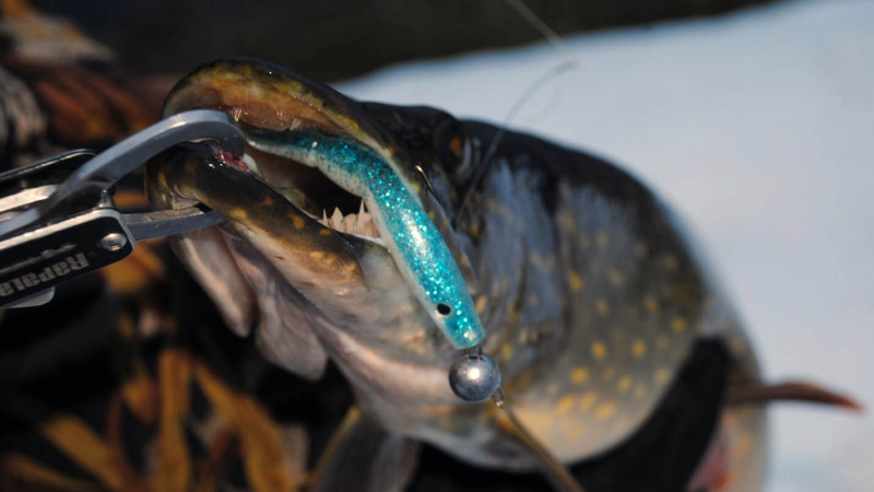 Утяжеляюсь до двенадцати грамм. Чебураха – офсет – съедобка Piglet Shad. Вся эта красота летит в самые дебри поваленных бревен. Проводка по классике: два оборота, пауза. На третьем или четвертом забросе, на выходе из ямы, четкая поклевка. Подсечка, и на том конце заходила неплохая рыбка. Без всяких сюрпризов, очень быстро подвожу щуку и вытаскиваю на берег.