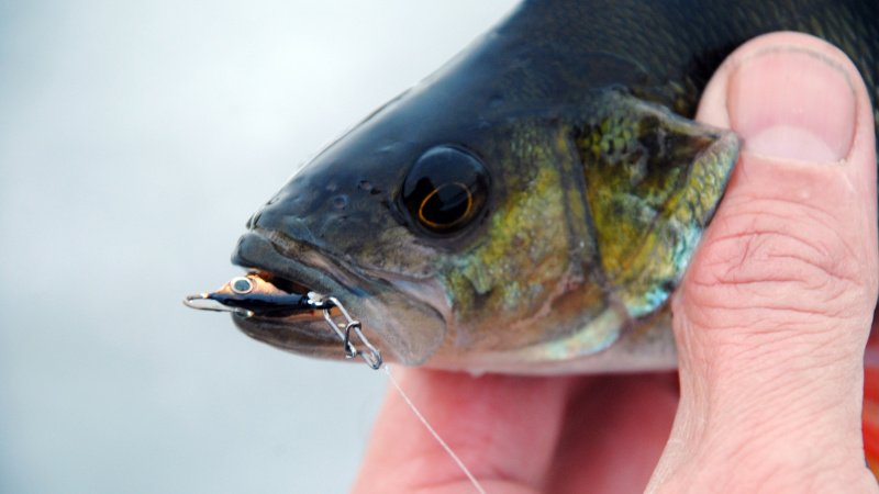 При такой ловле, а заточены мы обычно под окуня, используются легкие удильники без кивков, леска диаметром не толще 0.14 мм и балансиры размером до трех сантиметров. В этом сезоне оказываясь в таких условиях ловли, я с успехом пользовался балансом от компании Strike Pro – Ice Baby 25.